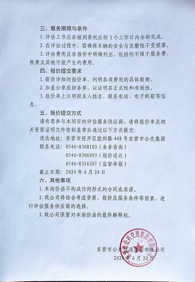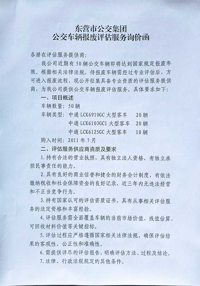 我公司近期有50輛公交車(chē)輛即將達(dá)到國(guó)家規(guī)定報(bào)廢年限。根據(jù)相關(guān)法律法規(guī),待報(bào)廢車(chē)輛需經(jīng)過(guò)專(zhuān)業(yè)評(píng)估后,方可進(jìn)入報(bào)廢流程,現(xiàn)公開(kāi)征集具備專(zhuān)業(yè)資質(zhì)的評(píng)估服務(wù)提供商,為我公司提供公交車(chē)輛報(bào)廢評(píng)估服務(wù)。具體要求如下: