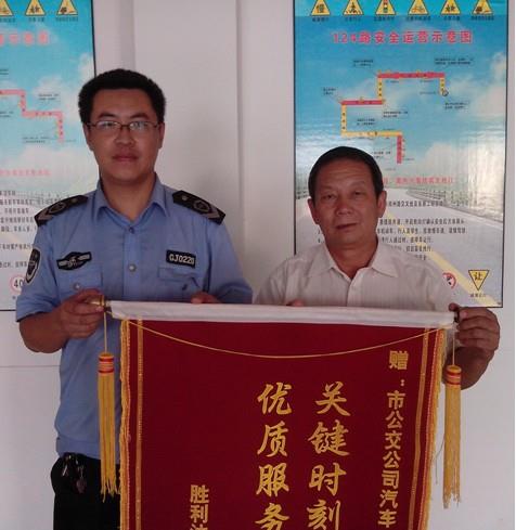 2012年8月16日,勝利油田長龍橡塑有限責任公司辦公室田主任拿著一面寫有“關鍵時刻見真情 優(yōu)質(zhì)服務品德高”的錦旗來到市公交公司汽車一隊,感謝車隊寧學峰師傅的高尚品德。