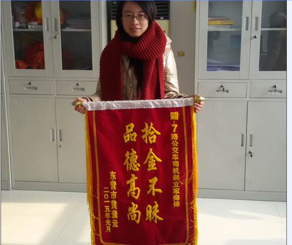 昨日,黃素云來到車隊,送來一面寫有“拾金不昧、品德高尚”的錦旗,感謝車隊駕駛員郝立軍拾金不昧的高尚品德。我們全體員工都應該向郝立軍學習,加強思想道德修養,繼續同心協力,開拓創新,用我們的高素質、高品德、高修養共創公司更加美好的明天。