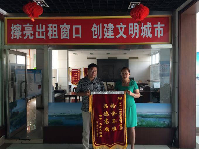 6月24日,市民肖先生拿著一面寫有“拾金不昧,品德高尚”的錦旗來到市公交出租汽車運營中心,表揚出租車駕駛員岳偽仿,夸其是一位拾金不昧的好同志。