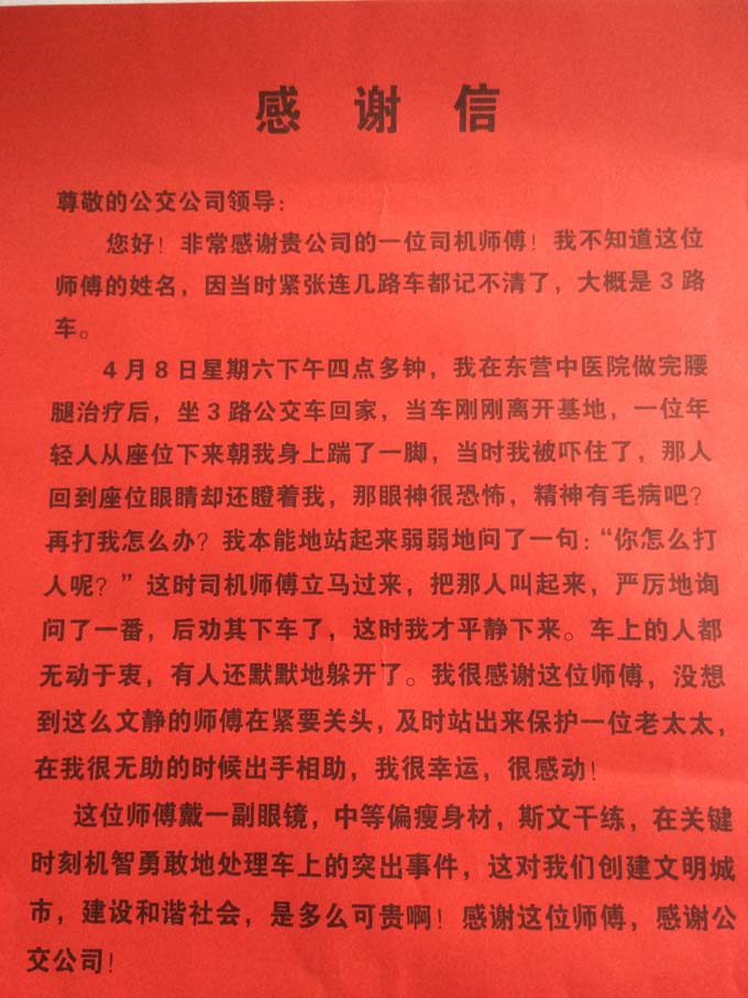 2017年4月18日下午,家住錦華四區(qū)的牟翠英老人拿著感謝信來到市公交公司汽車一隊,感謝3路車駕駛員馬慶龍師傅見義勇為的高尚品德。據(jù)車隊了解得知,4月8日下午,牟翠英老人乘坐馬慶龍駕駛的從公交西站至公交公司的3路公交車回家,車輛行駛途中,一位年輕人朝牟翠英老人身上踹了一腳,回到座位后眼睛還瞪著牟翠英老人,牟翠英老人當(dāng)時很害怕。正在駕駛車輛的駕駛員馬慶龍發(fā)現(xiàn)后,在銀座購物廣場站點(diǎn)停下車,進(jìn)一步了解情況后,勸那位年輕人下了車。