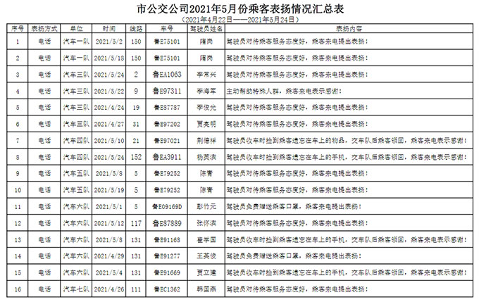 近段時間以來,東營公交廣大駕駛員在做好疫情防控的同時,積極投身公交服務質量提升工作。經過持續不斷的努力,公交服務質量明顯提高,涌現了一大批的好人好事,受到乘客的好評,大力營造了“比、學、趕、幫、超”的良好氛圍。 廣大駕駛員要以受到表揚的同志為榜樣,愛崗敬業、無私奉獻,為樹立和維護公司的外在形象作出貢獻。同時也希望受到表揚的同志戒驕戒躁,再接再厲,發揮模范作用,繼續為公司的服務提升工作貢獻力量。