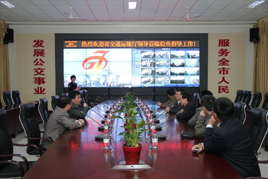 11月18日上午,省交通運輸廳“兩保兩樹”活動指導(dǎo)組王際遜處長一行,在市交通運輸局工會主席王愛軍、運管處處長李希俊、市公交公司經(jīng)理朱新民等有關(guān)領(lǐng)導(dǎo)的陪同下,到東營公交智能調(diào)度指揮中心對3G視頻監(jiān)控系統(tǒng)進(jìn)行了檢查指導(dǎo)。