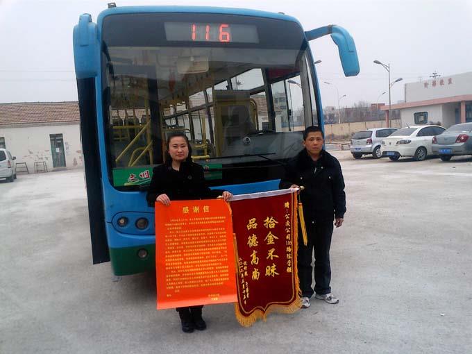 2012年3月14,勝利設(shè)計(jì)院職工于家星女士拿著一面寫(xiě)有“拾金不昧、品德高尚”的錦旗和感謝信來(lái)到市公交公司汽車四隊(duì),感謝116路魯E08350車駕駛員陳學(xué)強(qiáng)師傅拾金不昧的高尚品德。
